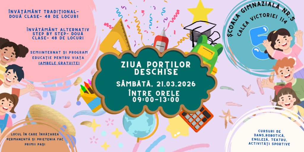 Școala Gimnazială Nr. 5 are bucuria de a vă invita la ZIUA PORȚILOR DESCHISE, sâmbătă, 21 martie 2026, între orele 9:00 și 13:00.
